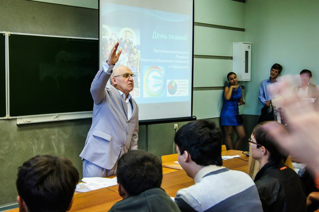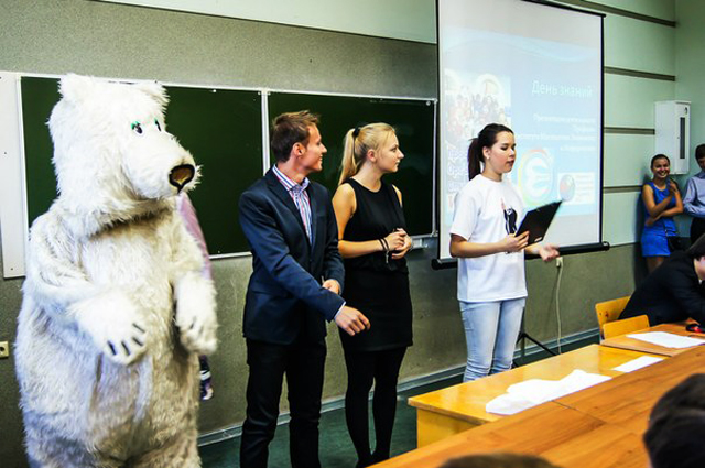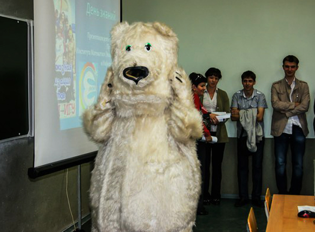 На дворе первый день осени, 1 сентября, и как обычно в этот день бывает, в ИМЭИ ИГУ впервые открылись двери для первокурсников и распахнулись еще шире для студентов старших курсов. В этом году первокурсников решили приветствовать не совсем обычным образом. На крыльце перед корпусом был размещен стенд с полезной информацией для первокурсников, ребят встречали активисты профбюро вместе с белым медведем и угощали конфетами. Затем, как это обычно происходит, в 318 аудитории состоялась встреча первокурсников и дирекции ИМЭИ. Со словами приветствия выступил директор ИМЭИ ИГУ Юрий Дмитриевич Корольков, заместитель декана по воспитательной работе Елена Анатольевна Головко и представители профбюро ИМЭИ. Председатель профбюро ИМЭИ Ксения Ситникова рассказала о преимуществах вступления в студенческий профсоюз, Юрий Соколовский поделился опытом участия в конференциях не только университетского, но и всероссийского масштаба, Екатерина Голуб – председатель культурно-массовой комиссии появилась в образе белого медведя и рассказала об интересных мероприятиях, которые традиционно проводятся в нашем институте, Наталья Трунева – Первокурсница ИМЭИ-2012 делилась впечатлениями о том, как, будучи студенткой первого курса, завоевала этот титул, затем Дарья Олейник – председатель пресс-центра ИМЭИ рассказала об истории создания газеты ИМЭИ.news, а также о планах на будущее, Александр Шишкин – капитан команды ЧГК «Мозголомы», Король ИМЭИ-2012 и по совместительству заместитель председателя профбюро ИМЭИ - о Клубе Интеллектуалов ИГУ и ежегодном конкурсе “Король и Королева”. Затем первокурсников познакомили с кураторами, объяснили правила внутреннего распорядка, ребята вступали в профсоюз, получали студенческие билеты и заполняли различные анкеты. После официальной части кураторы предложили новоиспеченным студентам поучаствовать в играх и конкурсах.