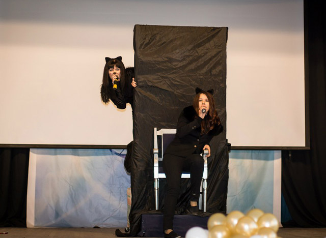 И вот мы опять наблюдаем, как Коровьев и Бегемот ищут хозяйку на бал. Начали отбор они с самых юных студентов. Стоит отметить, что в этом году у нас очень активные и талантливые первокурсники. В качестве подарка институту они подготовили забавные номера. Экономисты и матобесы показали сценки: по мотивам сказки «Алиса в стране чудес» и «Если бы я не поступил в ИМЭИ…» соответственно. Группа 2122 спела песню, которая сопровождалась забавным видеороликом, снятым в стенах института, а группы 2111 и 2121 исполнили песни-поздравления уже своей альма-матер. Кстати, накануне празднования дня рождения для студентов-первокурсников проводился конкурс на лучшую стенгазету (работы можно было посмотреть в холле первого этажа). И качеством, и количеством первый приз завоевали студенты группы 2111.