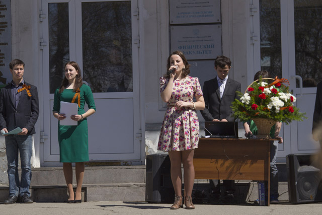 В этот теплый и солнечный день студенты и преподаватели математического и физического факультетов собрались на площадке перед корпусом, где была представлена литературно-музыкальная композиция, которая была подготовлена студентами двух факультетов. Песни и стихи повествовали о трудностях тех лет, о подвигах, которые совершали солдаты и о том, как родные ждали их возвращения домой.