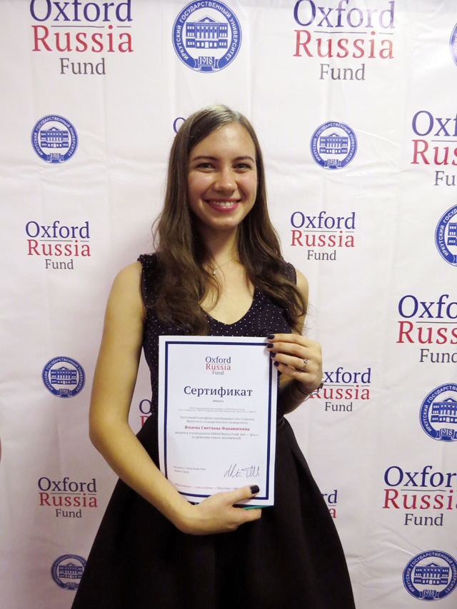 14 сентября в актовом зале Педагогического института ИГУ состоялось вручение сертификатов победителям конкурса Оксфордского Российского Фонда на соискание стипендий. 120 студентов Иркутского государственного университета были удостоены награды за выдающие достижения в научной деятельности. Стипендиатами ОРФ стали 5 студенток Института математики, экономики и информатики: Елена Красюк, Алина Новикова, Гита Тулохонова, Анастасия Борисова – студентки 3 курса, Светлана Ямаева - 4 курс.