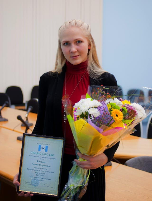 23 декабря 2010 г. состоялось вручение именных стипендий губернатора Иркутской области Дмитрия Мезенцева за 2010. Среди семи студентов Иркутского государственного университета, удостоенных этой стипендии, есть и студентка 5 курса специальности "Математические методы в экономике" ИМЭИ ИГУ Алёна Головко. Поздравляем!