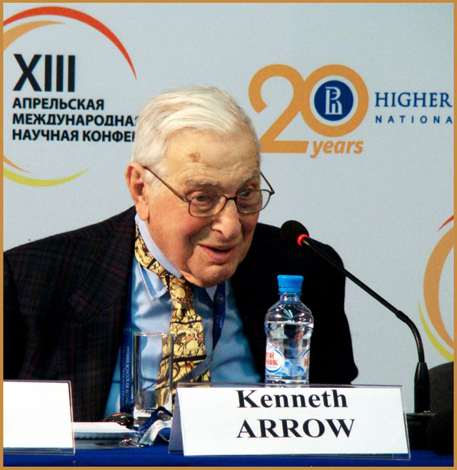 Одним из самых заметных событий нынешней конференции, несомненно, явился приезд Нобелевского лауреата Кеннета Эрроу с докладом, посвященным информационным основаниям экономики. Человек-легенда, доказавший в 1951 году знаменитую теорему о невозможности демократии, в 1953-м вместе с Жераром Дебре построивший теорию общего равновесия, а в 1972-м получивший четвертую в истории Нобелевскую премию по экономике, не только жив и здоров, но и выступает с докладами на конференциях.